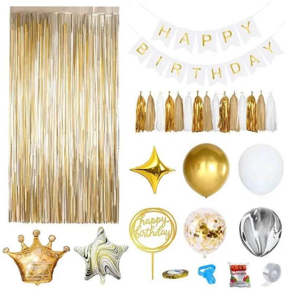 60 balloner i forskellige farver; 1x ballon formet som en krone; 2x balloner formet som en femtakket stjerne; 2x balloner formet som en firetakket stjerne; 1x gardin af glitrende bånd; 1x Happy Birthday-banner; 5x sæt farverige dekorative kvaster; 1x Happy Birthday-kagedekoration; dekorationsbånd, ballonbindeværktøj, lim og fastgørelsestape til balloner.