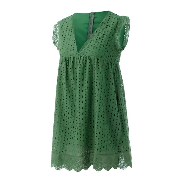 Kjolens kant falder blødt omkring benene og får dem til at se længere ud. De korte, luftige ærmer giver et feminint touch, der fuldender designet. Disse detaljer gør kjolen både behagelig og unikt stilfuld.