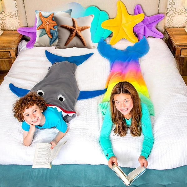Vælg mellem hajhale- eller havfruehale-tæppet. Det er perfekt til livlige børn, der elsker at lege og bruge fantasien. Det tilfredsstiller deres eventyrlyst, mens det holder dem varme og trygge.