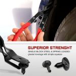 Fjederbelastet løftemekanisme omdanner en lille håndbevægelse til kontrolleret kraft – placer hovedet, klem, clipsen frigives. Tangen håndterer runde clips i dørpaneler og loftbeklædning, det korte brækjern til firkantede fastgørelser i kofangere og panelkanter, det lange brækjern når dybe fastgørelser i instrumentbræt og hjulkasser uden akavede vinkler.